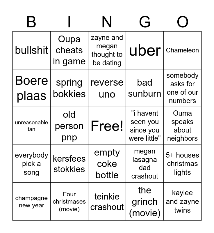This bingo card has a free space and 26 words: empty coke bottle, the grinch (movie), reverse uno, Four christmases (movie), Chameleon, bullshit, Boere plaas, Oupa cheats in game, Ouma speaks about neighbors, megan lasagna dad crashout, bad sunburn, unreasonable tan, 5+ houses christmas lights, champagne new year, old person pnp, checkers 60 60, uber, everybody pick a song, zayne and megan thought to be dating, kaylee and zayne twins, somebody asks for one of our numbers, teinkie crashout, "i havent seen you since you were little", kersfees stokkies, spring bokkies and pepermint crisp tert.