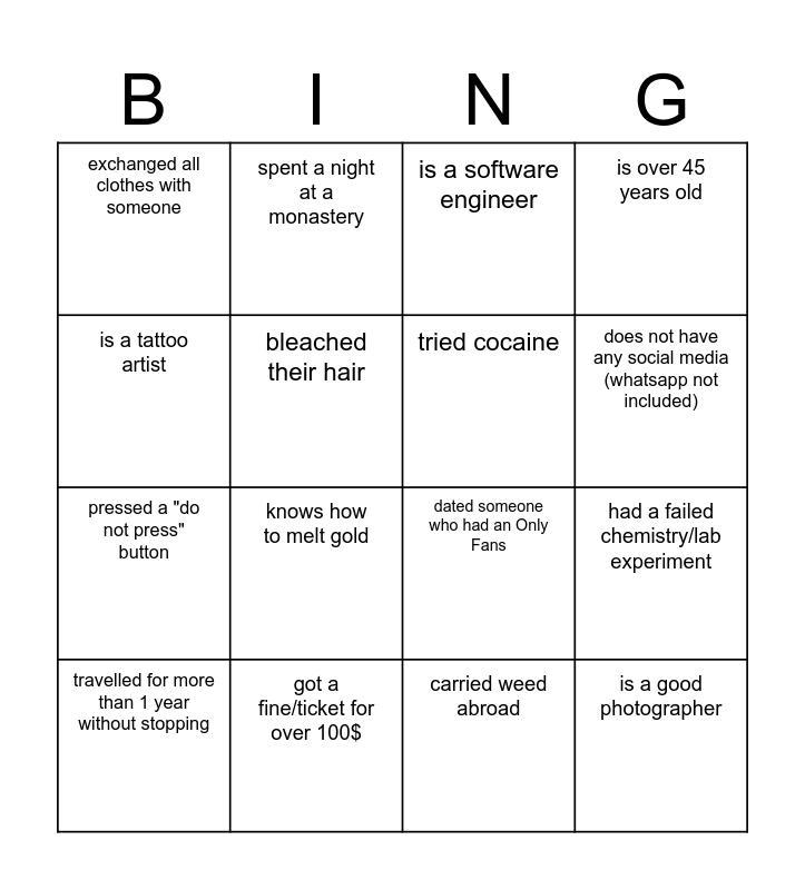 This bingo card has 16 words: got a fine/ticket for over 100$, had a failed chemistry/lab experiment, is a software engineer, exchanged all clothes with someone, pressed a "do not press" button, spent a night at a monastery, dated someone who had an Only Fans, carried weed abroad, is a tattoo artist, bleached their hair, travelled for more than 1 year without stopping, is over 45 years old, knows how to melt gold, does not have any social media (whatsapp not included), tried cocaine and is a good photographer.
