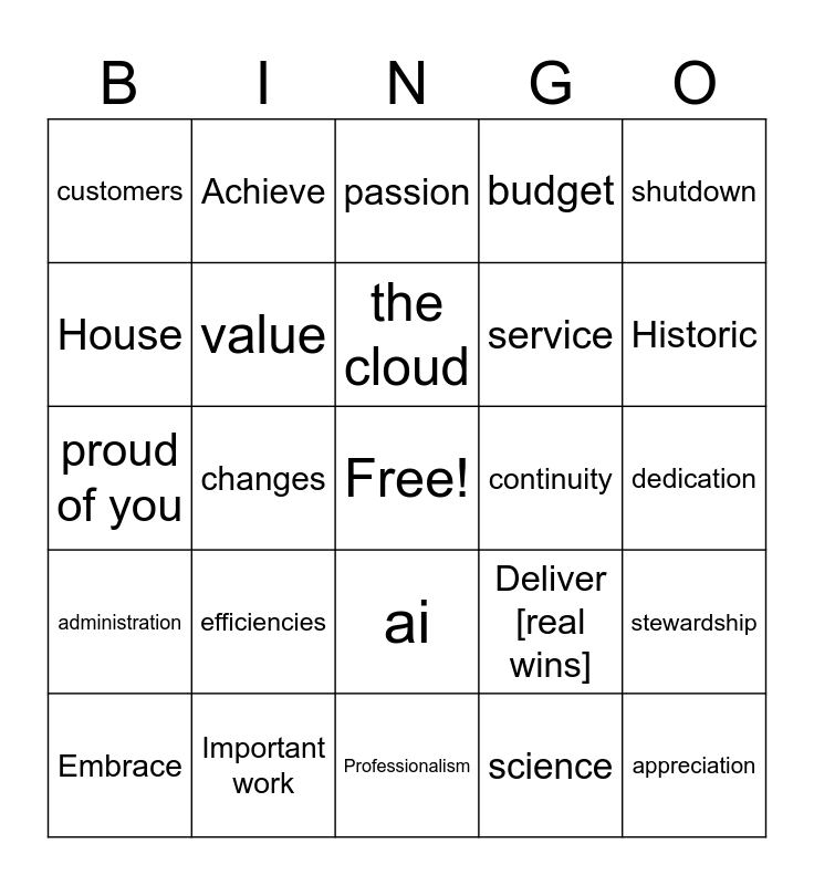 This bingo card has a free space and 40 words: Tough year, proud of you, mission, value, Important work, ai, the cloud, transition essential, shutdown, administration, changes, budget, appreciation, dedication, continuity, efficiencies, value chain, customers, climate, passion, stewardship, science, service, House, Senate, President, Gratitude, Exciting, Consequential, Transform, Results, Embrace, Move fast [fast pace], Deliver [real wins], Historic, Professionalism, Grateful, Challenge, Achieve and Commitment.