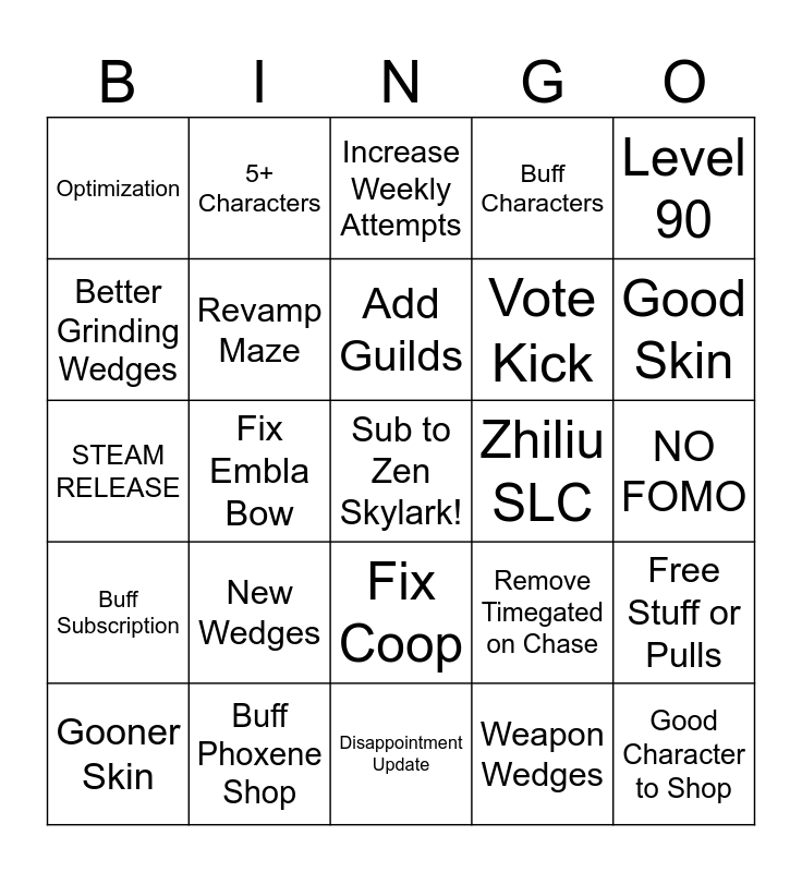 This bingo card has a free space and 24 words: New Wedges, Buff Phoxene Shop, Add Guilds, Gooner Skin, Level 90, Optimization, Better Grinding Wedges, 5+ Characters, Zhiliu SLC, Fix Coop, Vote Kick, STEAM RELEASE, Remove Timegated on Chase, Free Stuff or Pulls, Revamp Maze, Weapon Wedges, NO FOMO, Increase Weekly Attempts, Good Skin, Fix Embla Bow, Good Character to Shop, Buff Subscription, Buff Characters and Disappointment Update.