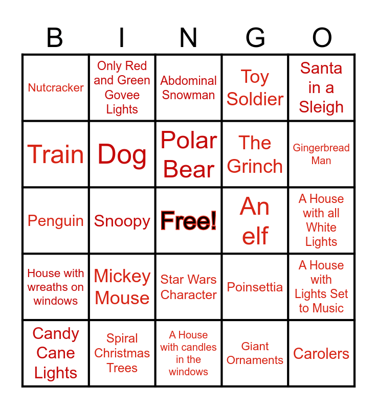 This bingo card has a free space and 33 words: Pink Flamingo, Snowman, Snoopy, House with 5 deer, House with wreaths on windows, Dog, Santa in a Sleigh, Candy Cane Lights, Only Red and Green Govee Lights, Nativity, Polar Bear, Abdominal Snowman, The Word "JOY", An Angel, An elf, Gingerbread Man, Spiral Christmas Trees, Penguin, Mickey Mouse, Poinsettia, Star Wars Character, Snowglobe, Nutcracker, A House with all White Lights, A House with candles in the windows, Carolers, Toy Soldier, The Grinch, Train, A House with Lights Set to Music, Mrs. Claus, Giant Ornaments and Star.
