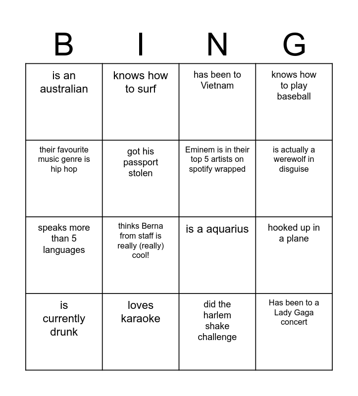 This bingo card has 16 words: loves karaoke, hooked up in a plane, has been to Vietnam, is an australian, speaks more than 5 languages, knows how to surf, is a aquarius, did the harlem shake challenge, their favourite music genre is hip hop, got his passport stolen, is currently drunk, knows how to play baseball, thinks Berna from staff is really (really) cool!, is actually a werewolf in disguise, Eminem is in their top 5 artists on spotify wrapped and Has been to a Lady Gaga concert.