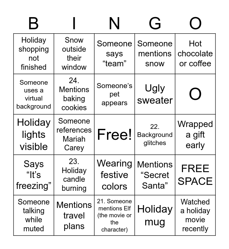 This bingo card has a free space and 26 words: Wearing festive colors, Holiday mug, Someone’s pet appears, Mentions travel plans, Hot chocolate or coffee, Holiday shopping not finished, Someone uses a virtual background, Snow outside their window, Wrapped a gift early, Mentions “Secret Santa”, Ugly sweater, Holiday lights visible, FREE SPACE, Someone talking while muted, Someone references Mariah Carey, Holiday snack nearby, Someone mentions snow, Says “It’s freezing”, Someone says “team”, Watched a holiday movie recently, O, 21. Someone mentions Elf (the movie or the character), 22. Background glitches, 23. Holiday candle burning, 24. Mentions baking cookies and 25. Wearing fuzzy socks.
