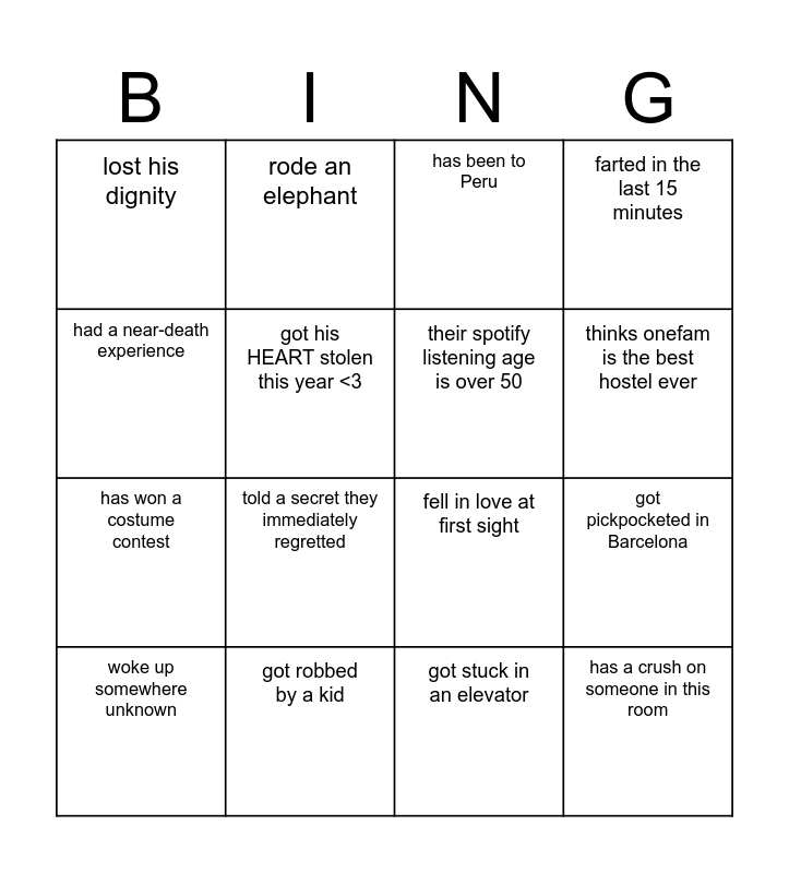 This bingo card has 16 words: got robbed by a kid, got pickpocketed in Barcelona, has been to Peru, lost his dignity, has won a costume contest, rode an elephant, fell in love at first sight, got stuck in an elevator, had a near-death experience, got his HEART stolen this year <3, woke up somewhere unknown, farted in the last 15 minutes, told a secret they immediately regretted, thinks onefam is the best hostel ever, their spotify listening age is over 50 and has a crush on someone in this room.