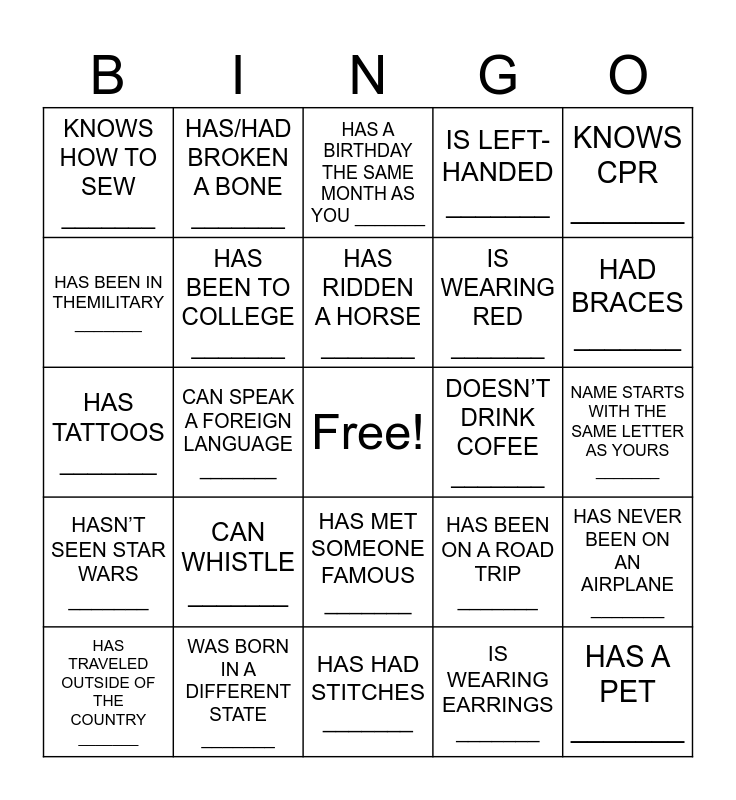 This bingo card has a free space and 29 words: HAS TRAVELED OUTSIDE OF THE COUNTRY _______, CAN PLAY AN INSTRUMENT _______, CAN SPEAK A FOREIGN LANGUAGE _______, HAS A BIRTHDAY THIS MONTH _______, KNOWS HOW TO SEW _______, HAS A BIRTHDAY THE SAME MONTH AS YOU _______, HAS BEEN TO COLLEGE _______, CAN WHISTLE _______, DOESN’T DRINK COFEE _______, WAS BORN IN A DIFFERENT STATE _______, NAME STARTS WITH THE SAME LETTER AS YOURS _______, HAS A PET _______, HAS HAD STITCHES _______, IS WEARING EARRINGS _______, HAD BRACES _______, HAS BEEN TO A PRO SPORTING EVENT _______, HAS MET SOMEONE FAMOUS _______, HASN’T SEEN STAR WARS _______, KNOWS CPR _______, HAS TATTOOS _______, HAS BEEN ON A ROAD TRIP _______, WAS BORN ON IN A DIFFERENT COUNTRY _______, IS WEARING RED _______, HAS BEEN IN THEMILITARY _______, IS LEFT-HANDED _______, HAS/HAD BROKEN A BONE _______, HAS NEVER BEEN ON AN AIRPLANE _______, HAS RIDDEN A HORSE _______ and HAS BEEN ON A CRUISE _______.
