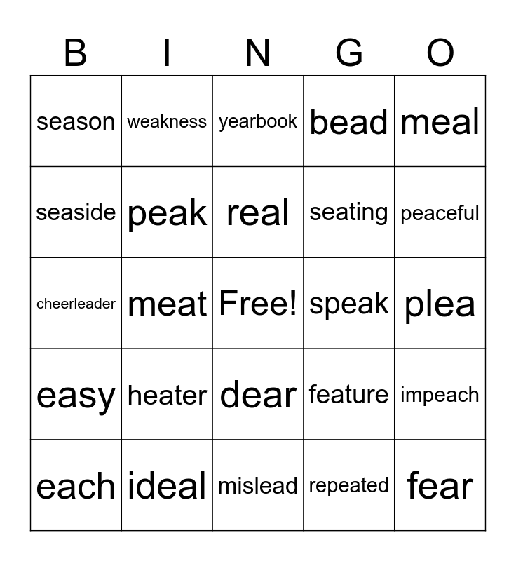 This bingo card has a free space and 39 words: ear, pea, year, peak, each, dear, real, team, meal, easy, meat, bead, fear, plea, speak, heater, defeat, season, beaver, feature, seaside, mislead, seating, peaceful, increase, creature, pleasing, upstream, colleague, weakness, colleague, treatment, yearbook, ideal, repeated, leadership, impeach, cheerleader and seasick.
