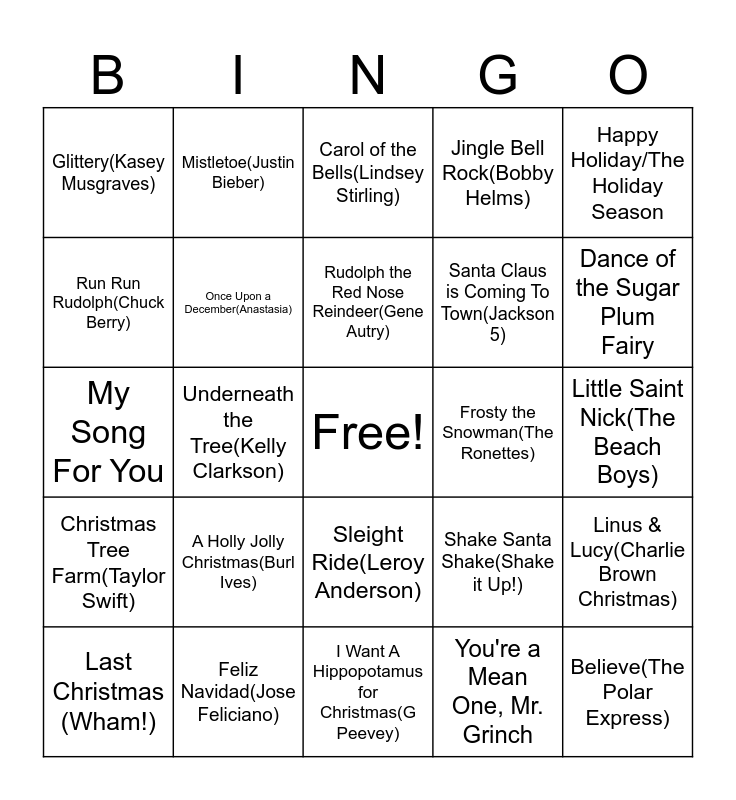 This bingo card has a free space and 29 words: Last Christmas (Wham!), Santa Tell Me(Ariana Grande), Underneath the Tree(Kelly Clarkson), All I Want For Christmas(Mariah Carey), Glittery(Kasey Musgraves), Carol of the Bells(Lindsey Stirling), Once Upon a December(Anastasia), A Holly Jolly Christmas(Burl Ives), Frosty the Snowman(The Ronettes), Feliz Navidad(Jose Feliciano), Little Saint Nick(The Beach Boys), Believe(The Polar Express), I Want A Hippopotamus for Christmas(G Peevey), You're a Mean One, Mr. Grinch, Dance of the Sugar Plum Fairy, Christmas Eve/Sarajevo 12/24, Sleight Ride(Leroy Anderson), Christmas Tree Farm(Taylor Swift), Happy Holiday/The Holiday Season, My Song For You, Shake Santa Shake(Shake it Up!), Hot Chocolate(The Polar Express), Santa Claus is Coming To Town(Jackson 5), Run Run Rudolph(Chuck Berry), Jingle Bell Rock(Bobby Helms), Mistletoe(Justin Bieber), Linus & Lucy(Charlie Brown Christmas), Rudolph the Red Nose Reindeer(Gene Autry) and My Favorite Things(Julie Andrews).