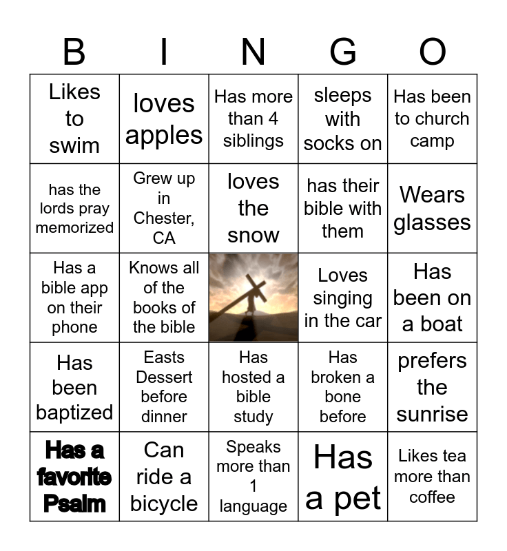 This bingo card has a free space and 29 words: Has a favorite Psalm, Has been on a mission, Knows all of the books of the bible, Has been to Europe, Likes to swim, Has more than 4 siblings, Grew up in Chester, CA, Easts Dessert before dinner, Loves singing in the car, Can ride a bicycle, Has been on a boat, Likes tea more than coffee, Speaks more than 1 language, Has a pet, Wears glasses, Has broken a bone before, Has hosted a bible study, Has been baptized, Has been to church camp, Has a bible app on their phone, Has broken a bone before, Is left-handed, has their bible with them, has the lords pray memorized, sleeps with socks on, loves apples, prefers the sunrise, loves the snow and has never seen the ocean.