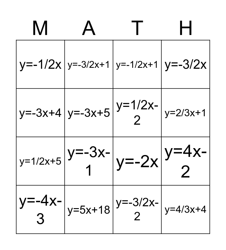 This bingo card has 24 words: y=4/5x-4, y=-7x-5, y=2/3x+1, y=x+5, y=-3x+4, y=-1/2x, y=-3x+5, y=-3/2x+1, y=5x+18, y=x-1, y=1/2x+5, y=-2x, y=-x-4, y=-2x+1, y=1/2x-2, y=4/5x-1, y=-3/2x-2, y=-1/2x+1, y=-3x-1, y=4x-2, y=-4x-3, y=4/3x+4, y=-3/2x and y=1/4x-3.