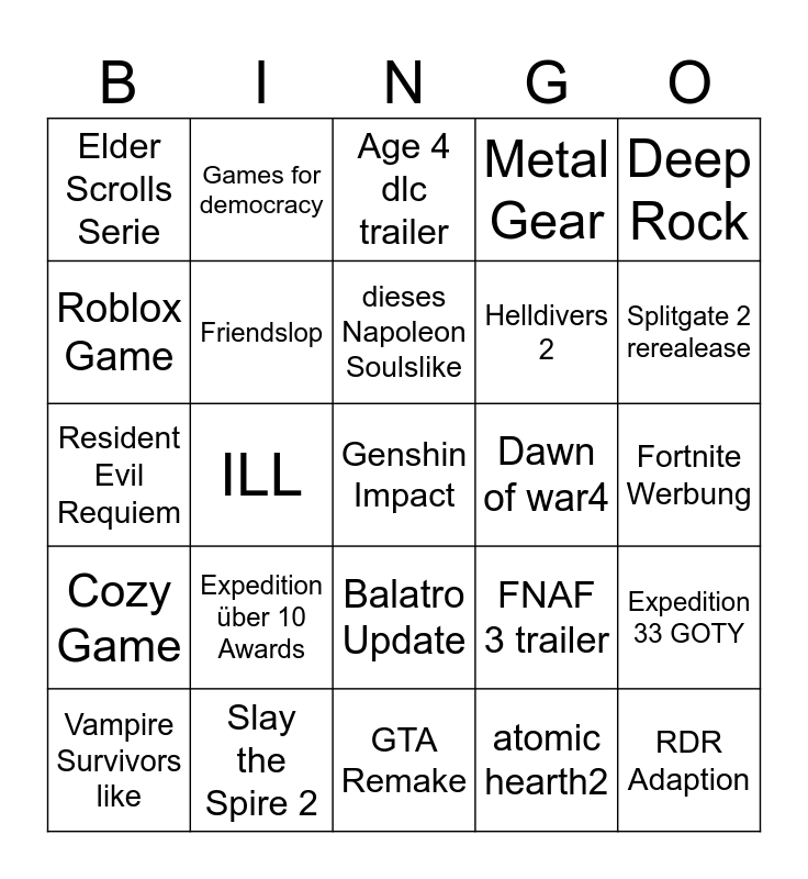 This bingo card has a free space and 24 words: Expedition über 10 Awards, Slay the Spire 2, dieses Napoleon Soulslike, Vampire Survivors like, Deep Rock, Elder Scrolls Serie, Roblox Game, Games for democracy, Dawn of war4, Balatro Update, Helldivers 2, Resident Evil Requiem, FNAF 3 trailer, Expedition 33 GOTY, Friendslop, atomic hearth2, Fortnite Werbung, Age 4 dlc trailer, Splitgate 2 rerealease, ILL, RDR Adaption, Cozy Game, Metal Gear and GTA Remake.