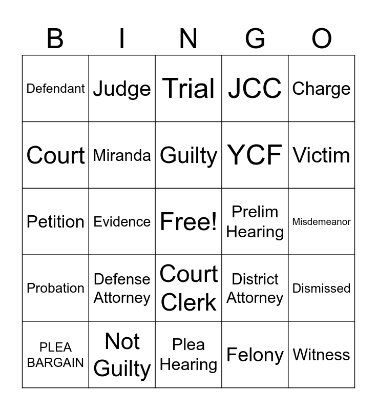 This bingo card has a free space and 24 words: Defense Attorney, Not Guilty, Guilty, PLEA BARGAIN, Charge, Defendant, Court, Judge, Prelim Hearing, Court Clerk, YCF, Petition, District Attorney, Dismissed, Miranda, Felony, Misdemeanor, Trial, Victim, Evidence, Witness, Probation, JCC and Plea Hearing.