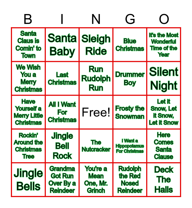 This bingo card has a free space and 29 words: Jingle Bells, White Christmas, All I Want For Christmas, Silver Bells, Santa Claus is Comin' to Town, Sleigh Ride, Last Christmas, Jingle Bell Rock, Frosty the Snowman, Grandma Got Run Over By a Reindeer, Let it Snow, Let it Snow, Let it Snow, Deck The Halls, You're a Mean One, Mr. Grinch, Rudolph the Red Nosed Reindeer, Silent Night, Feliz Navidad, The Nutcracker, Rockin' Around the Christmas Tree, It's the Most Wonderful Time of the Year, Have Yourself a Merry Little Christmas, I Want a Hippopotamus For Christmas, Carol of The Bells, Drummer Boy, We Wish You a Merry Christmas, Blue Christmas, Santa Baby, Here Comes Santa Clause, Run Rudolph Run and Winter Wonderland.