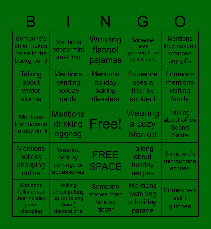 This bingo card has a free space and 25 words: Wearing holiday earrings or accessories, Someone shows their holiday décor, Mentions holiday baking disasters, Someone talks about their holiday plans changing, Mentions they haven’t wrapped any gifts, Someone’s child makes noise in the background, Talking about winter storms, Mentions peppermint anything, Wearing a cozy blanket, FREE SPACE, Someone uses a filter by accident, Mentions their favorite holiday drink, Talking about holiday recipes, Someone’s microphone echoes, Mentions sending holiday cards, Someone’s dog barks, Talking about office Secret Santa, Wearing flannel pajamas, Someone mentions visiting family, Mentions drinking eggnog, Someone’s WiFi glitches, Talking about putting up (or taking down) decorations, Mentions holiday shopping online, Someone uses speakerphone by accident and Mentions watching a holiday parade.