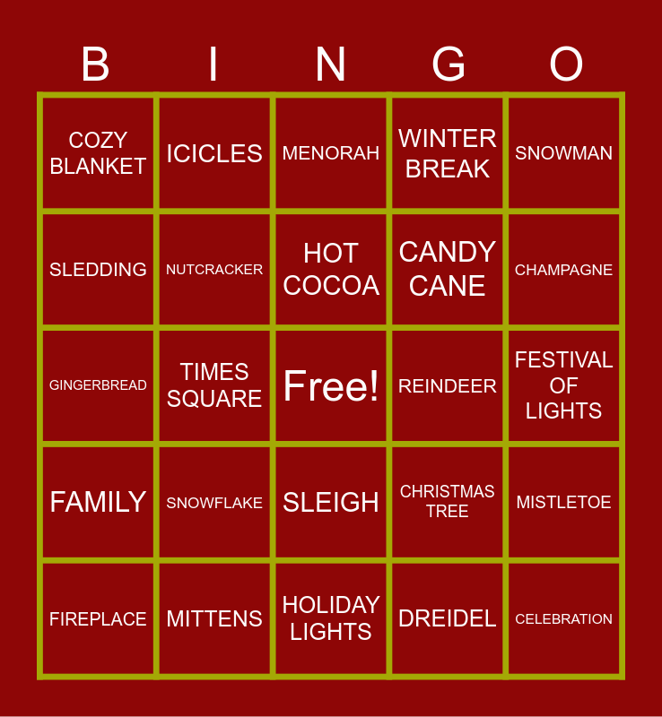 This bingo card has a free space and 24 words: SNOWFLAKE, MITTENS, HOT COCOA, FIREPLACE, SNOWMAN, COZY BLANKET, SLEDDING, ICICLES, REINDEER, SLEIGH, CANDY CANE, GINGERBREAD, CHRISTMAS TREE, MISTLETOE, NUTCRACKER, DREIDEL, FESTIVAL OF LIGHTS, MENORAH, CHAMPAGNE, TIMES SQUARE, CELEBRATION, FAMILY, WINTER BREAK and HOLIDAY LIGHTS.