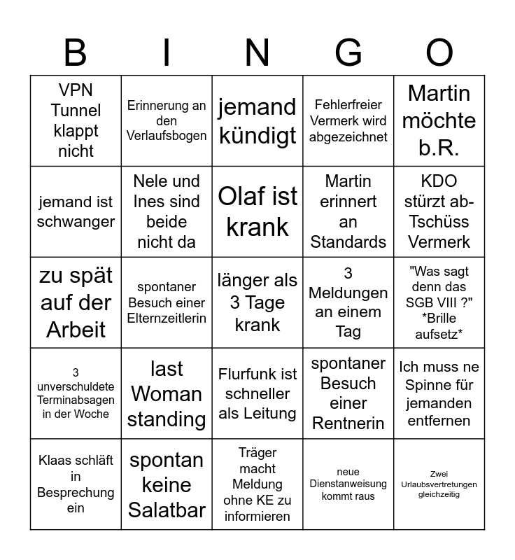 This bingo card has 25 words: last Woman standing, Träger macht Meldung ohne KE zu informieren, Olaf ist krank, Klaas schläft in Besprechung ein, Martin möchte b.R., VPN Tunnel klappt nicht, jemand ist schwanger, Erinnerung an den Verlaufsbogen, 3 Meldungen an einem Tag, Flurfunk ist schneller als Leitung, Martin erinnert an Standards, zu spät auf der Arbeit, spontaner Besuch einer Rentnerin, Ich muss ne Spinne für jemanden entfernen, Nele und Ines sind beide nicht da, Zwei Urlaubsvertretungen gleichzeitig, "Was sagt denn das SGB VIII ?" *Brille aufsetz*, jemand kündigt, KDO stürzt ab- Tschüss Vermerk, spontaner Besuch einer Elternzeitlerin, länger als 3 Tage krank, spontan keine Salatbar, 3 unverschuldete Terminabsagen in der Woche, Fehlerfreier Vermerk wird abgezeichnet and neue Dienstanweisung kommt raus.