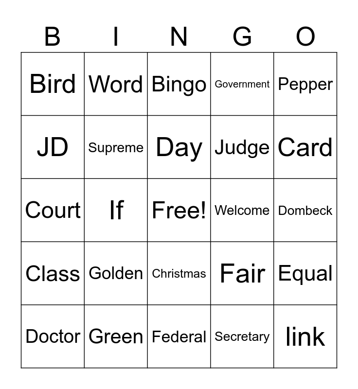 This bingo card has a free space and 24 words: Golden, Green, Day, Doctor, Pepper, Bird, JD, Word, Welcome, Christmas, Judge, Court, Fair, Equal, Supreme, Secretary, Dombeck, Bingo, Card, If, link, Class, Government and Federal.
