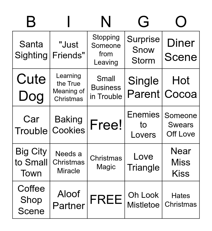 This bingo card has a free space and 24 words: Needs a Christmas Miracle, Aloof Partner, Small Business in Trouble, Coffee Shop Scene, Diner Scene, Santa Sighting, Cute Dog, "Just Friends", Enemies to Lovers, Christmas Magic, Single Parent, Car Trouble, Love Triangle, Near Miss Kiss, Learning the True Meaning of Christmas, Oh Look Mistletoe, Someone Swears Off Love, Stopping Someone from Leaving, Hot Cocoa, Baking Cookies, Hates Christmas, Big City to Small Town, Surprise Snow Storm and FREE.