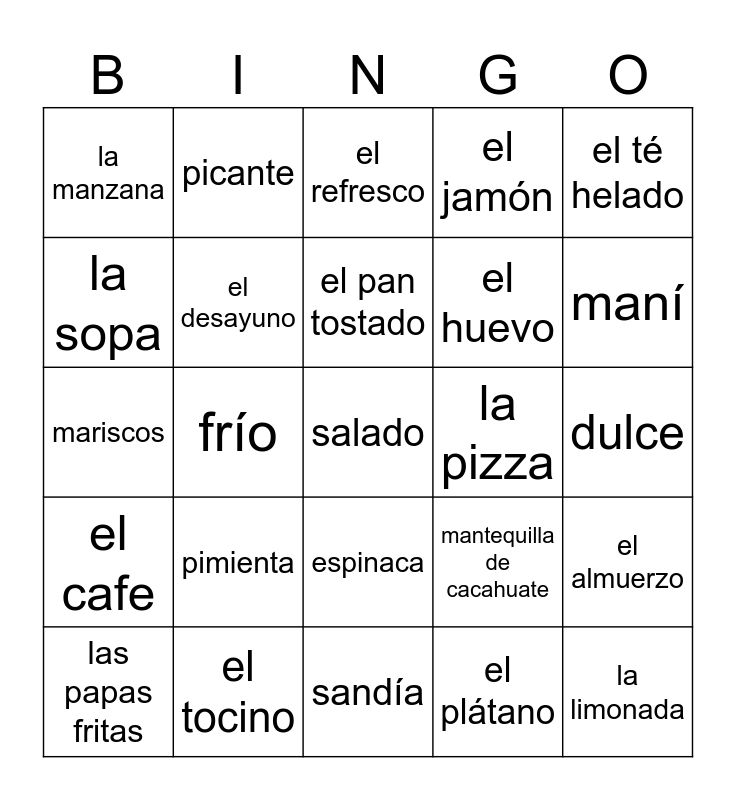 This bingo card has a free space and 62 words: el agua, el tocino, la galleta, el cafe, el té, el cereal, el desayuno, la hamburguesa, el huevo, la fresa, el jamón, el jugo, la sopa, la leche, la naranja, la manzana, la limonada, el té helado, el pan, el pan tostado, la pizza, el refresco, las papas fritas, el plátano, la salchicha, el perrito caliente, el queso, el sándwich, el almuerzo, la comida, la bebida, la ensalada, la cena, el yogur, dulce, picante, amargo, caliente, frío, saludable, mariscos, frijoles, pimienta, sopa, maní, mantequilla de cacahuate, fideos, pepino, mermelada, salchicha, espinaca, sandía, azúcar, jugo, rico, delicioso, crujiente, agrio, jugoso, cremoso, seco and sabor.