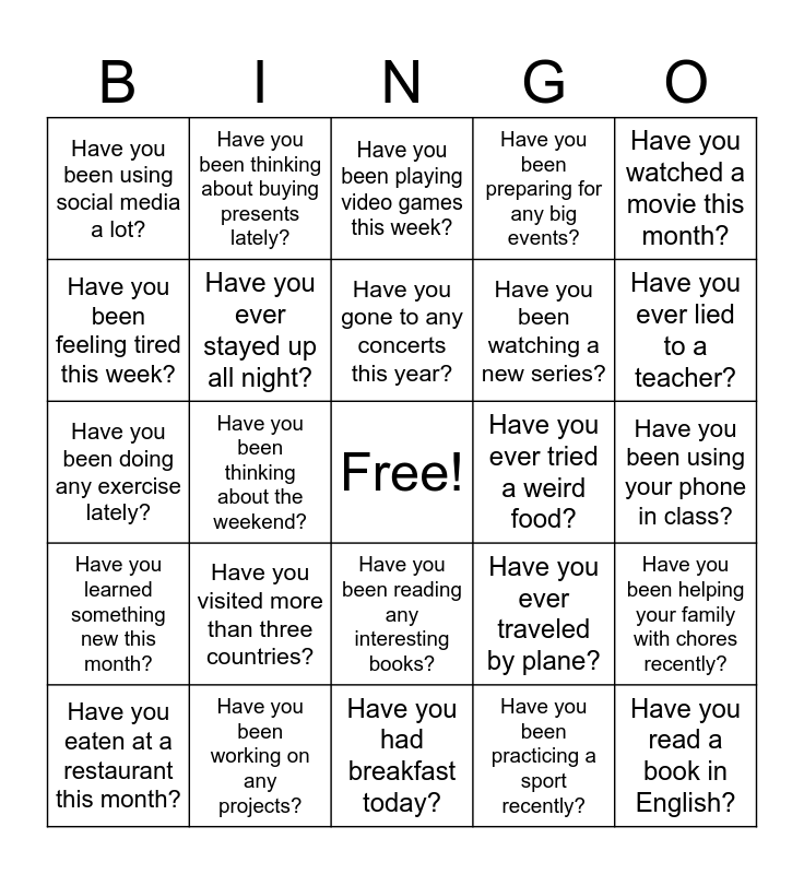This bingo card has a free space and 29 words: Have you eaten at a restaurant this month?, Have you been talking to a friend a lot lately?, Have you been thinking about the weekend?, Have you cleaned your room this week?, Have you been using social media a lot?, Have you been playing video games this week?, Have you ever stayed up all night?, Have you visited more than three countries?, Have you ever tried a weird food?, Have you been working on any projects?, Have you been using your phone in class?, Have you read a book in English?, Have you had breakfast today?, Have you been practicing a sport recently?, Have you ever lied to a teacher?, Have you been learning any new hobbies?, Have you been reading any interesting books?, Have you learned something new this month?, Have you watched a movie this month?, Have you been doing any exercise lately?, Have you ever traveled by plane?, Have you ever given a speech?, Have you been watching a new series?, Have you been feeling tired this week?, Have you been preparing for any big events?, Have you been thinking about buying presents lately?, Have you been helping your family with chores recently?, Have you gone to any concerts this year? and Have you visited a museum this year?.