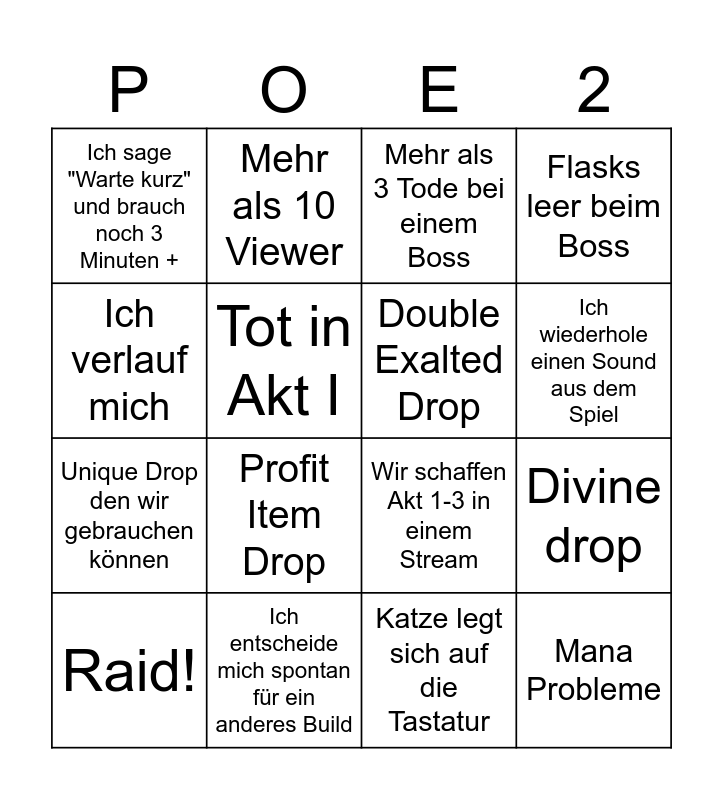 This bingo card has 16 words: Ich entscheide mich spontan für ein anderes Build, Divine drop, Mehr als 3 Tode bei einem Boss, Ich sage "Warte kurz" und brauch noch 3 Minuten +, Unique Drop den wir gebrauchen können, Mehr als 10 Viewer, Wir schaffen Akt 1-3 in einem Stream, Katze legt sich auf die Tastatur, Ich verlauf mich, Tot in Akt I, Raid!, Flasks leer beim Boss, Profit Item Drop, Ich wiederhole einen Sound aus dem Spiel, Double Exalted Drop and Mana Probleme.