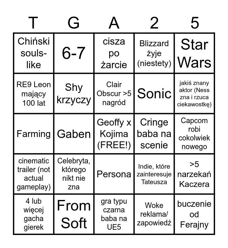 This bingo card has a free space and 24 words: Celebryta, którego nikt nie zna, From Soft, Clair Obscur >5 nagród, 4 lub więcej gacha gierek, Star Wars, Chiński souls-like, RE9 Leon mający 100 lat, 6-7, Cringe baba na scenie, Persona, Sonic, Farming, Indie, które zainteresuje Tateusza, >5 narzekań Kaczera, Shy krzyczy, Woke reklama/ zapowiedź, Capcom robi cokolwiek nowego, cisza po żarcie, jakiś znany aktor (Ness zna i rzuca ciekawostkę), Gaben, buczenie od Ferajny, cinematic trailer (not actual gameplay), Blizzard żyje (niestety) and gra typu czarna baba na UE5.