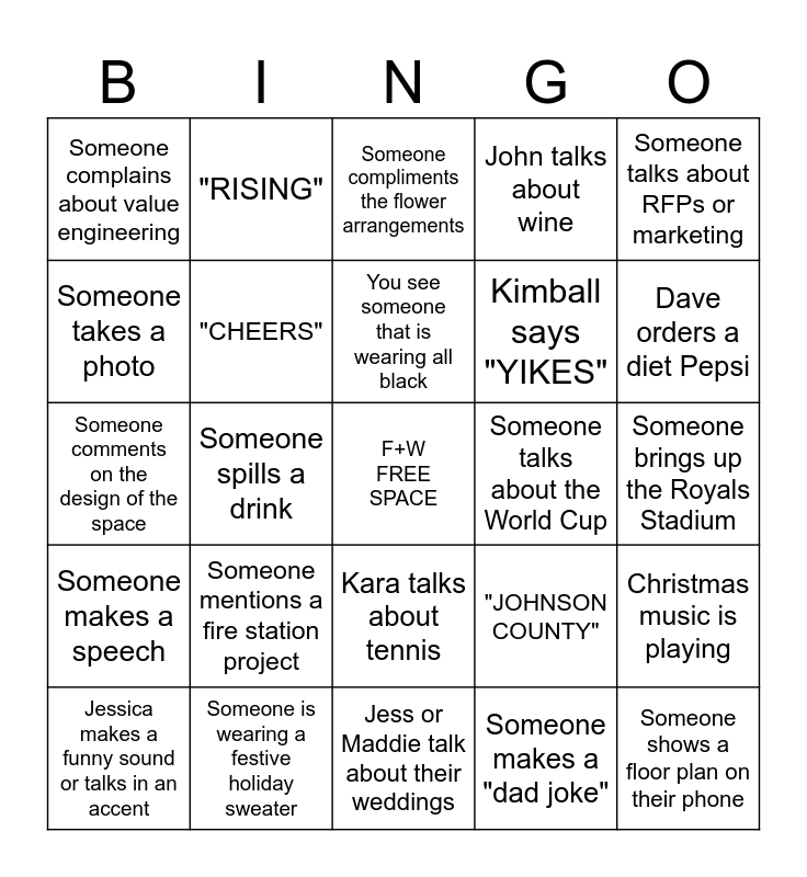 This bingo card has a free space and 34 words: Greg whistles something, Someone makes a "dad joke", Megan makes a SpongeBob reference, Alex makes a "dad joke" or has dry humor, Someone makes a speech, "CHEERS", Someone talks about RFPs or marketing, Jessica makes a funny sound or talks in an accent, "RISING", Someone talks about the Chiefs, You see someone that is wearing all black, Someone compliments the flower arrangements, Someone mentions KU or K-State, Someone is double fisting their drinks, Someone talks about the World Cup, Dave orders a diet Pepsi, Someone is wearing a festive holiday sweater, Someone comments on the design of the space, Someone mentions a fire station project, "JOHNSON COUNTY", Kara talks about tennis, "INJECTING HUMANITY", Someone complains about value engineering, Someone brings up the Royals Stadium, Jess or Maddie talk about their weddings, Someone shows a floor plan on their phone, John talks about wine, Ellen says "IT'S GONNA BE GREAT", Kimball says "YIKES", Someone takes a photo, Someone comments about the room's acoustics, Someone spills a drink, Christmas music is playing and Someone compliments the food.