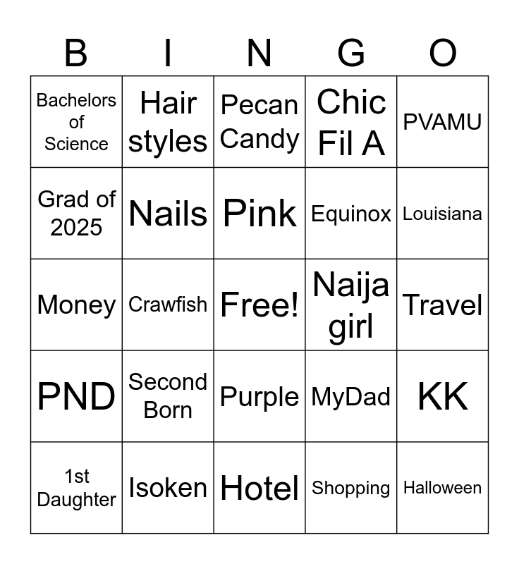 This bingo card has a free space and 24 words: Second Born, Isoken, Pink, 1st Daughter, PVAMU, Bachelors of Science, Grad of 2025, Hair styles, Naija girl, Purple, Equinox, Money, MyDad, KK, Nails, Shopping, Travel, Pecan Candy, Louisiana, Crawfish, Halloween, PND, Chic Fil A and Hotel.