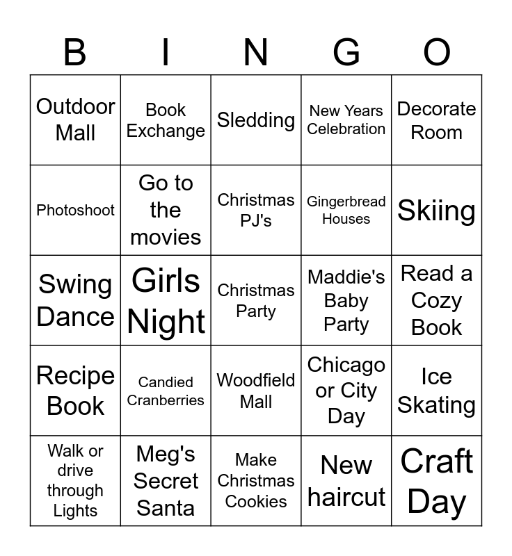 This bingo card has a free space and 24 words: Candied Cranberries, Meg's Secret Santa, Christmas PJ's, Walk or drive through Lights, Decorate Room, Outdoor Mall, Photoshoot, Book Exchange, Maddie's Baby Party, Woodfield Mall, Gingerbread Houses, Swing Dance, Chicago or City Day, Ice Skating, Go to the movies, New haircut, Read a Cozy Book, Sledding, Skiing, Girls Night, Craft Day, Recipe Book, New Years Celebration and Make Christmas Cookies.