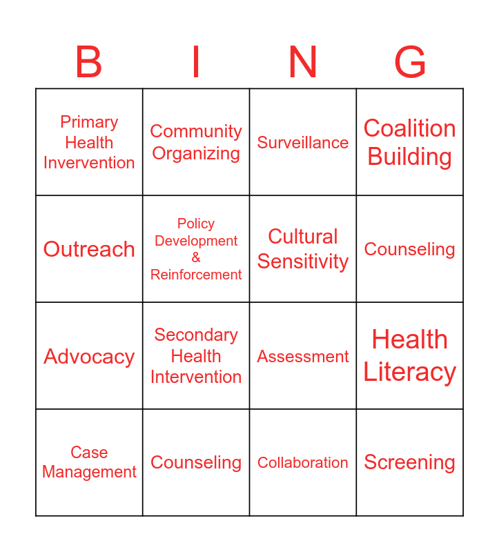 This bingo card has 16 words: Counseling, Health Literacy, Surveillance, Primary Health Invervention, Advocacy, Community Organizing, Assessment, Collaboration, Outreach, Policy Development & Reinforcement, Case Management, Coalition Building, Secondary Health Intervention, Counseling, Cultural Sensitivity and Screening.