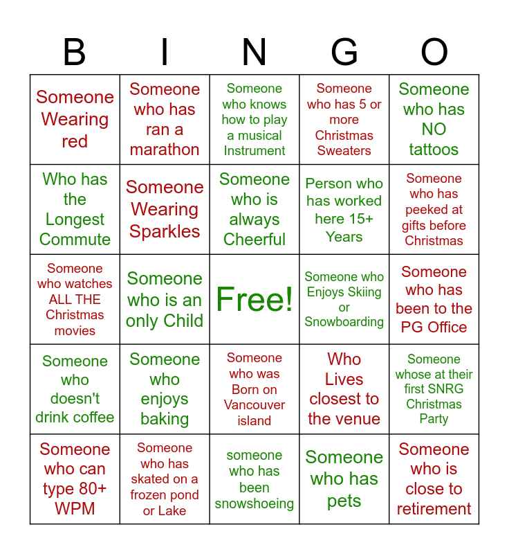 This bingo card has a free space and 24 words: Someone who enjoys baking, Someone who has skated on a frozen pond or Lake, Someone who is always Cheerful, Someone who can type 80+ WPM, Someone who has NO tattoos, Someone Wearing red, Who has the Longest Commute, Someone who has ran a marathon, Someone who Enjoys Skiing or Snowboarding, Someone who was Born on Vancouver island, Person who has worked here 15+ Years, Someone who watches ALL THE Christmas movies, Who Lives closest to the venue, Someone whose at their first SNRG Christmas Party, Someone Wearing Sparkles, Someone who has pets, Someone who has been to the PG Office, Someone who knows how to play a musical Instrument, Someone who has peeked at gifts before Christmas, Someone who is an only Child, Someone who is close to retirement, Someone who doesn't drink coffee, Someone who has 5 or more Christmas Sweaters and someone who has been snowshoeing.