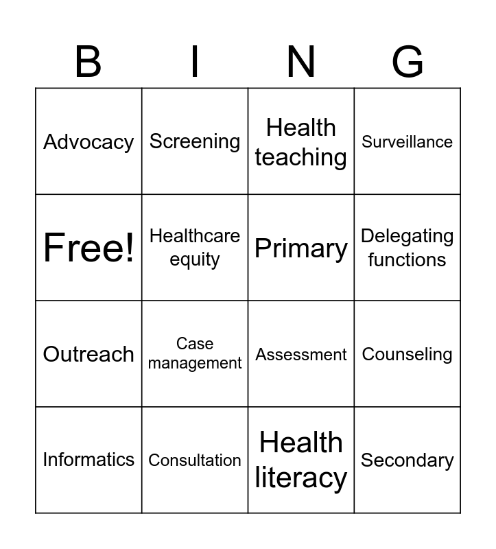 This bingo card has 16 words: Consultation, Counseling, Health teaching, Advocacy, Outreach, Screening, Assessment, Health literacy, Free!, Healthcare equity, Informatics, Surveillance, Case management, Delegating functions, Primary and Secondary.