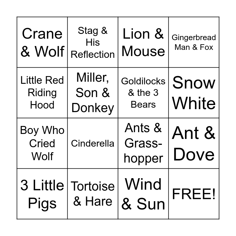 This bingo card has 16 words: Tortoise & Hare, Ant & Dove, Lion & Mouse, Crane & Wolf, Boy Who Cried Wolf, Stag & His Reflection, Ants & Grass-hopper, Wind & Sun, Little Red Riding Hood, Miller, Son & Donkey, 3 Little Pigs, Gingerbread Man & Fox, Cinderella, Snow White, Goldilocks & the 3 Bears and FREE!.