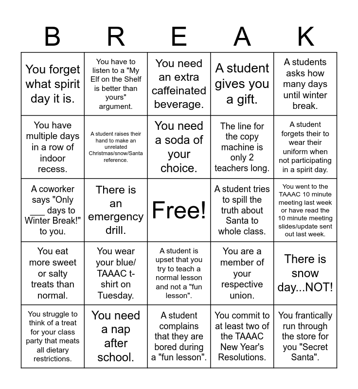 This bingo card has a free space and 24 words: You wear your blue/ TAAAC t-shirt on Tuesday., You need a nap after school., You need a soda of your choice., You struggle to think of a treat for your class party that meats all dietary restrictions., A students asks how many days until winter break., You forget what spirit day it is., You have multiple days in a row of indoor recess., You have to listen to a "My Elf on the Shelf is better than yours" argument., A student tries to spill the truth about Santa to whole class., A student is upset that you try to teach a normal lesson and not a "fun lesson"., The line for the copy machine is only 2 teachers long., A coworker says "Only ___ days to Winter Break!" to you., You are a member of your respective union., There is snow day...NOT!, A student raises their hand to make an unrelated Christmas/snow/Santa reference., You commit to at least two of the TAAAC New Year's Resolutions., You went to the TAAAC 10 minute meeting last week or have read the 10 minute meeting slides/update sent out last week., You need an extra caffeinated beverage., A student forgets their to wear their uniform when not participating in a spirit day., There is an emergency drill., You frantically run through the store for you "Secret Santa"., You eat more sweet or salty treats than normal., A student gives you a gift. and A student complains that they are bored during a "fun lesson"..