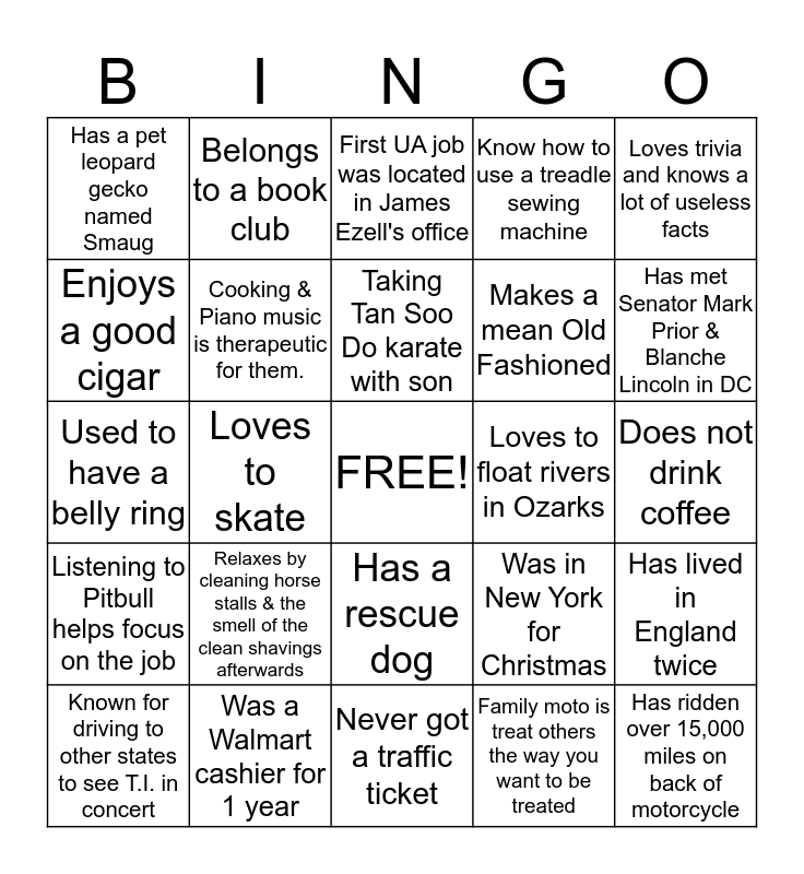 This bingo card has a free space and 24 words: Relaxes by cleaning horse stalls & the smell of the clean shavings afterwards, Was a Walmart cashier for 1 year, Taking Tan Soo Do karate with son, Known for driving to other states to see T.I. in concert, Loves trivia and knows a lot of useless facts, Has a pet leopard gecko named Smaug, Enjoys a good cigar, Belongs to a book club, Loves to float rivers in Ozarks, Has a rescue dog, Makes a mean Old Fashioned, Used to have a belly ring, Was in New York for Christmas, Has lived in England twice, Cooking & Piano music is therapeutic for them., Family moto is treat others the way you want to be treated, Does not drink coffee, First UA job was located in James Ezell's office, Has met Senator Mark Prior & Blanche Lincoln in DC, Loves to skate, Has ridden over 15,000 miles on back of motorcycle, Listening to Pitbull helps focus on the job, Know how to use a treadle sewing machine and Never got a traffic ticket.