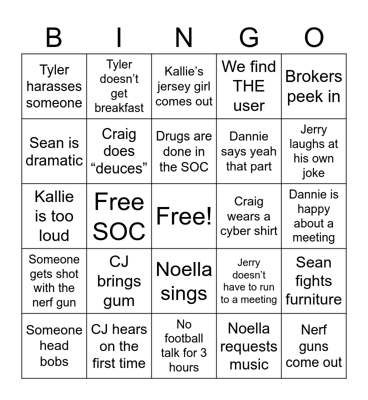 This bingo card has a free space and 24 words: CJ brings gum, CJ hears on the first time, Drugs are done in the SOC, Someone head bobs, Brokers peek in, Tyler harasses someone, Sean is dramatic, Tyler doesn’t get breakfast, Craig wears a cyber shirt, Noella sings, Dannie says yeah that part, Kallie is too loud, Jerry doesn’t have to run to a meeting, Sean fights furniture, Craig does “deuces”, Noella requests music, Dannie is happy about a meeting, Kallie’s jersey girl comes out, Jerry laughs at his own joke, Free SOC, Nerf guns come out, Someone gets shot with the nerf gun, We find THE user and No football talk for 3 hours.