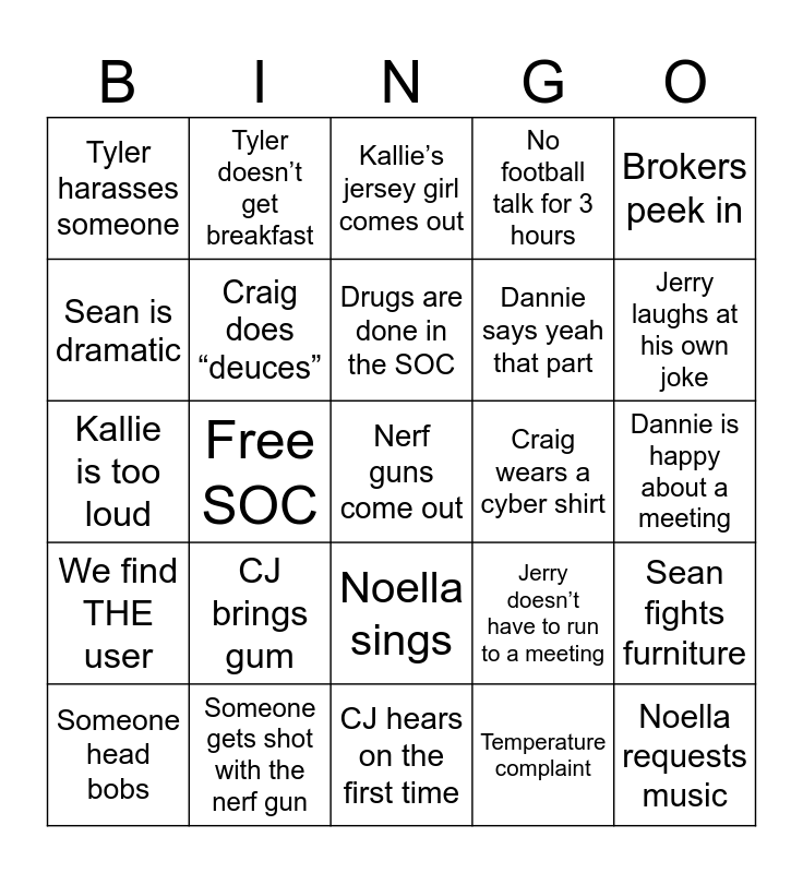 This bingo card has 25 words: CJ brings gum, CJ hears on the first time, Drugs are done in the SOC, Someone head bobs, Brokers peek in, Tyler harasses someone, Sean is dramatic, Tyler doesn’t get breakfast, Craig wears a cyber shirt, Noella sings, Dannie says yeah that part, Kallie is too loud, Jerry doesn’t have to run to a meeting, Sean fights furniture, Craig does “deuces”, Noella requests music, Dannie is happy about a meeting, Kallie’s jersey girl comes out, Jerry laughs at his own joke, Free SOC, Nerf guns come out, Someone gets shot with the nerf gun, We find THE user, No football talk for 3 hours and Temperature complaint.