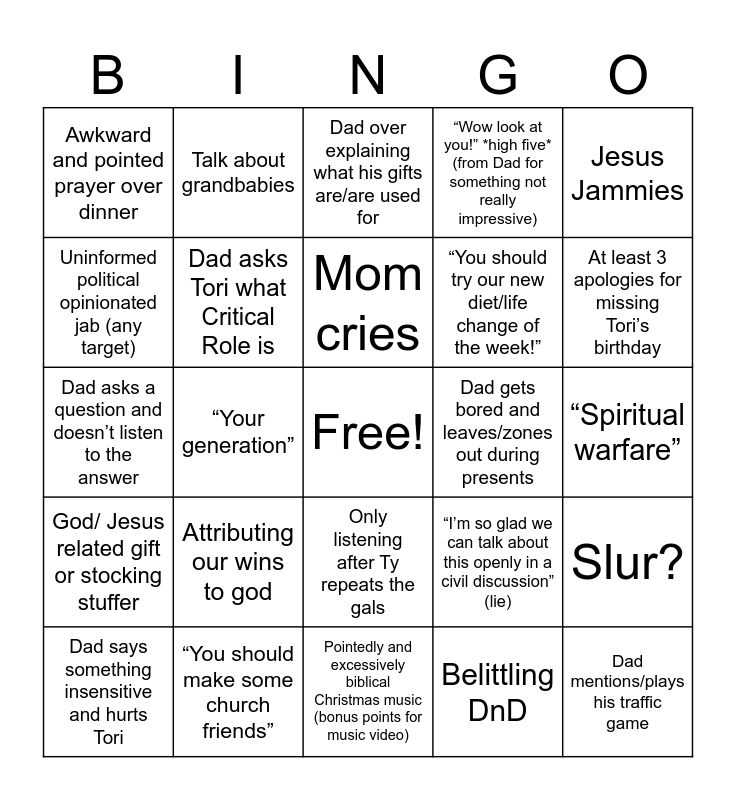 This bingo card has a free space and 24 words: Attributing our wins to god, “You should make some church friends”, Mom cries, Dad says something insensitive and hurts Tori, Jesus Jammies, Awkward and pointed prayer over dinner, Uninformed political opinionated jab (any target), Talk about grandbabies, Dad gets bored and leaves/zones out during presents, Only listening after Ty repeats the gals, “You should try our new diet/life change of the week!”, Dad asks a question and doesn’t listen to the answer, “I’m so glad we can talk about this openly in a civil discussion” (lie), Slur?, Dad asks Tori what Critical Role is, Belittling DnD, “Spiritual warfare”, Dad over explaining what his gifts are/are used for, At least 3 apologies for missing Tori’s birthday, “Your generation”, Dad mentions/plays his traffic game, God/ Jesus related gift or stocking stuffer, “Wow look at you!” *high five* (from Dad for something not really impressive) and Pointedly and excessively biblical Christmas music (bonus points for music video).