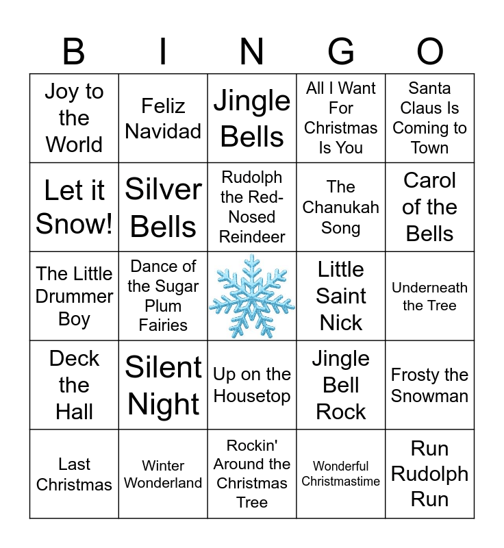 This bingo card has a free space and 27 words: Jingle Bell Rock, Dreidel Dreidel Dreidel, The Chanukah Song, Rockin' Around the Christmas Tree, Let it Snow!, Jingle Bells, Feliz Navidad, Deck the Hall, Little Saint Nick, Frosty the Snowman, The Little Drummer Boy, All I Want For Christmas Is You, Last Christmas, Winter Wonderland, Carol of the Bells, It's The Most Wonderful Time of the Year, Silver Bells, Rudolph the Red-Nosed Reindeer, Silent Night, Joy to the World, Underneath the Tree, Wonderful Christmastime, Dance of the Sugar Plum Fairies, Run Rudolph Run, Up on the Housetop, Santa Claus Is Coming to Town and Caroling, Caroling.