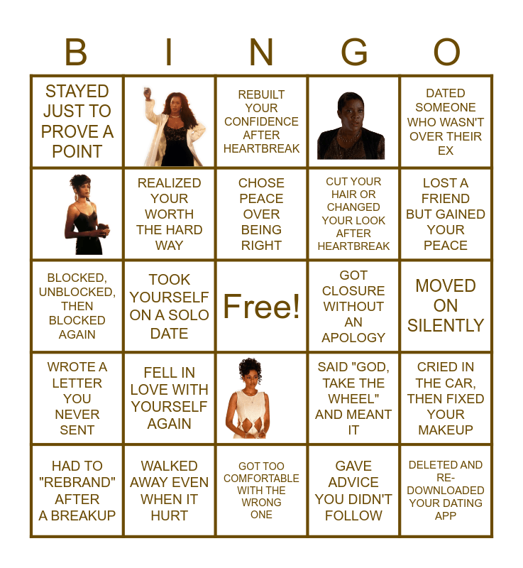 This bingo card has 5 images, a free space and 24 words: GAVE A SECOND CHANCE YOU SHOULDN'T HAVE, WALKED AWAY EVEN WHEN IT HURT, REBUILT YOUR CONFIDENCE AFTER HEARTBREAK, SAID "I'M HEALING" BUT WEREN'T, DATED SOMEONE WHO WASN'T OVER THEIR EX, STAYED JUST TO PROVE A POINT, REALIZED YOUR WORTH THE HARD WAY, CHOSE PEACE OVER BEING RIGHT, GOT CLOSURE WITHOUT AN APOLOGY, CRIED IN THE CAR, THEN FIXED YOUR MAKEUP, HAD TO "REBRAND" AFTER A BREAKUP, TOOK YOURSELF ON A SOLO DATE, GAVE ADVICE YOU DIDN'T FOLLOW, DELETED AND RE-DOWNLOADED YOUR DATING APP, BLOCKED, UNBLOCKED, THEN BLOCKED AGAIN, FORGAVE SOMEONE FOR YOURSELF, GOT TOO COMFORTABLE WITH THE WRONG ONE, SAID "GOD, TAKE THE WHEEL" AND MEANT IT, LOST A FRIEND BUT GAINED YOUR PEACE, WROTE A LETTER YOU NEVER SENT, FELL IN LOVE WITH YOURSELF AGAIN, OUTGREW SOMEONE YOU STILL LOVED FELL IN LOVE, CUT YOUR HAIR OR CHANGED YOUR LOOK AFTER HEARTBREAK and MOVED ON SILENTLY.