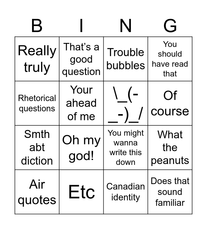 This bingo card has 16 words: Etc, What the peanuts, Trouble bubbles, Really truly, Smth abt diction, That’s a good question, You might wanna write this down, Canadian identity, Rhetorical questions, Your ahead of me, Air quotes, You should have read that, Oh my god!, Of course, \_(-_-)_/ and Does that sound familiar.