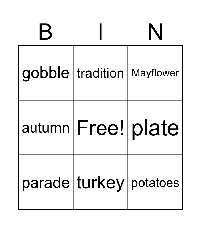 This bingo card has a free space and 15 words: inspire, candles, Mayflower, gobble, turkey, potatoes, travel, delicious, plate, feast, thankful, autumn, parade, tradition and serve.