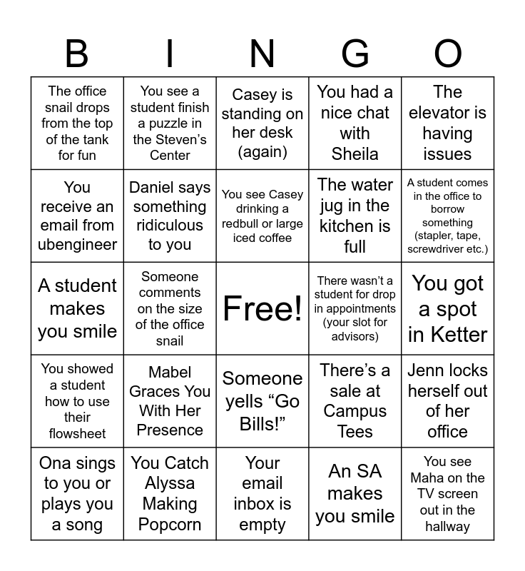 This bingo card has a free space and 24 words: Mabel Graces You With Her Presence, You Catch Alyssa Making Popcorn, You see Casey drinking a redbull or large iced coffee, Ona sings to you or plays you a song, The elevator is having issues, The office snail drops from the top of the tank for fun, You receive an email from ubengineer, You see a student finish a puzzle in the Steven’s Center, There wasn’t a student for drop in appointments (your slot for advisors), Someone yells “Go Bills!”, The water jug in the kitchen is full, A student makes you smile, There’s a sale at Campus Tees, Jenn locks herself out of her office, Daniel says something ridiculous to you, An SA makes you smile, You got a spot in Ketter, Casey is standing on her desk (again), A student comes in the office to borrow something (stapler, tape, screwdriver etc.), Someone comments on the size of the office snail, You see Maha on the TV screen out in the hallway, You showed a student how to use their flowsheet, You had a nice chat with Sheila and Your email inbox is empty.