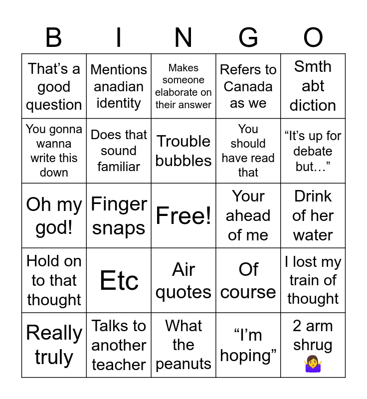 This bingo card has a free space and 25 words: Etc, What the peanuts, Trouble bubbles, Really truly, Smth abt diction, That’s a good question, You gonna wanna write this down, Mentions anadian identity, Your ahead of me, Air quotes, You should have read that, Oh my god!, Of course, I lost my train of thought, Does that sound familiar, I’m gonna remind you, Drink of her water, Makes someone elaborate on their answer, “It’s up for debate but…”, Finger snaps, 2 arm shrug 🤷♀️, Talks to another teacher, Hold on to that thought, Refers to Canada as we and “I’m hoping”.