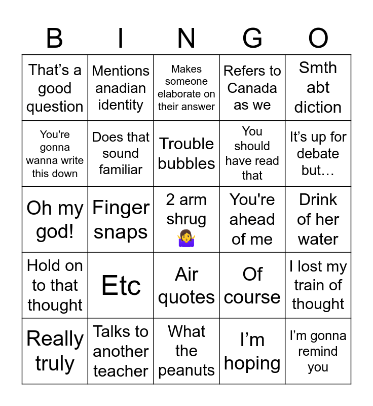 This bingo card has 25 words: Etc, What the peanuts, Trouble bubbles, Really truly, Smth abt diction, That’s a good question, You're gonna wanna write this down, Mentions anadian identity, You're ahead of me, Air quotes, You should have read that, Oh my god!, Of course, I lost my train of thought, Does that sound familiar, I’m gonna remind you, Drink of her water, Makes someone elaborate on their answer, It’s up for debate but…, Finger snaps, 2 arm shrug 🤷♀️, Talks to another teacher, Hold on to that thought, Refers to Canada as we and I’m hoping.