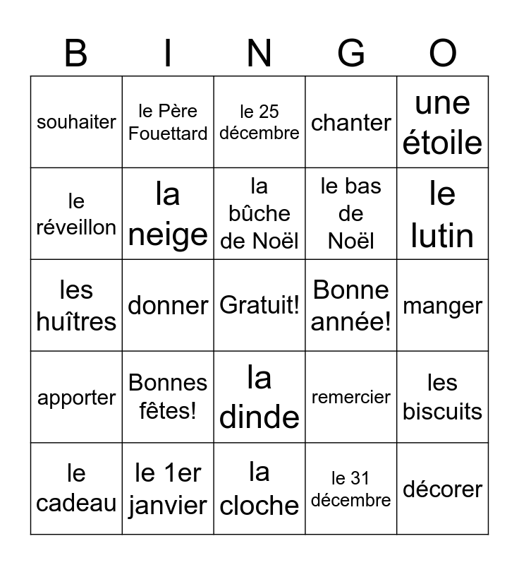 This bingo card has a free space and 39 words: le sapin, la bougie, (le) Noël, la neige, le cadeau, la dinde, la bûche de Noël, le renne, une étoile, apporter, donner, chanter, décorer, manger, Bonne année!, Bonnes fêtes!, Joyeux Noël!, souhaiter, fêter, remercier, le réveillon, la cloche, le bas de Noël, le lutin, un ange, Saint Nicholas, le Père Noël, l'hiver, le bonhomme de neige, le Père Fouettard, le 5 décembre, le 24 décembre, le 25 décembre, le 1er janvier, le 31 décembre, les bonbons, les biscuits, les huîtres and le foie gras.