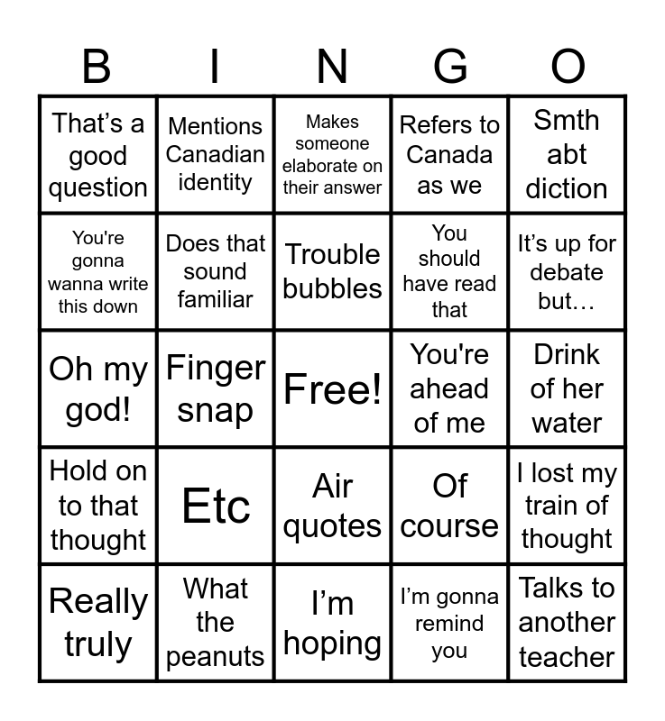 This bingo card has a free space and 24 words: Etc, What the peanuts, Trouble bubbles, Really truly, Smth abt diction, That’s a good question, You're gonna wanna write this down, Mentions Canadian identity, You're ahead of me, Air quotes, You should have read that, Oh my god!, Of course, I lost my train of thought, Does that sound familiar, I’m gonna remind you, Drink of her water, Makes someone elaborate on their answer, It’s up for debate but…, Finger snap, Talks to another teacher, Hold on to that thought, Refers to Canada as we and I’m hoping.