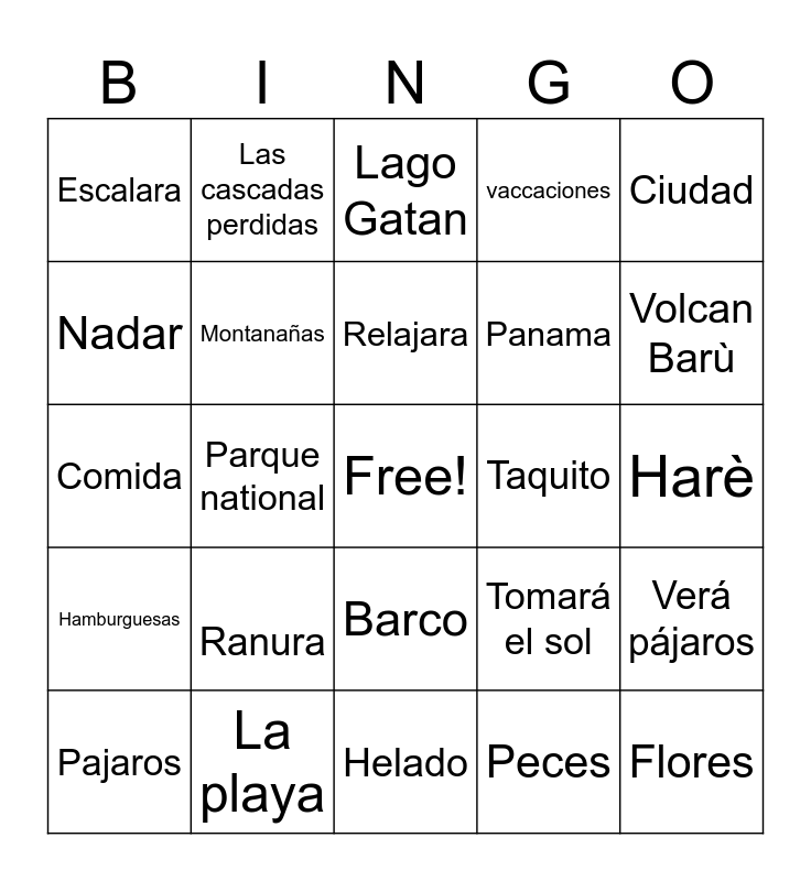 This bingo card has a free space and 24 words: Ranura, La playa, Relajara, Pajaros, Ciudad, Escalara, Nadar, Las cascadas perdidas, Taquito, Barco, Panama, Comida, Tomará el sol, Verá pájaros, Montanañas, Peces, Harè, Lago Gatan, Volcan Barù, Parque national, Flores, Hamburguesas, vaccaciones and Helado.