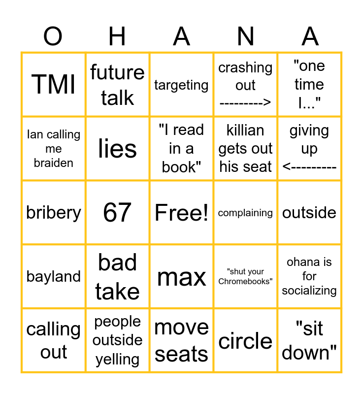 This bingo card has a free space and 24 words: calling out, bad take, "I read in a book", circle, "one time I...", TMI, future talk, targeting, complaining, outside, bribery, lies, "shut your Chromebooks", ohana is for socializing, Ian calling me braiden, people outside yelling, move seats, crashing out --------->, giving up <---------, bayland, 67, max, killian gets out his seat and "sit down".
