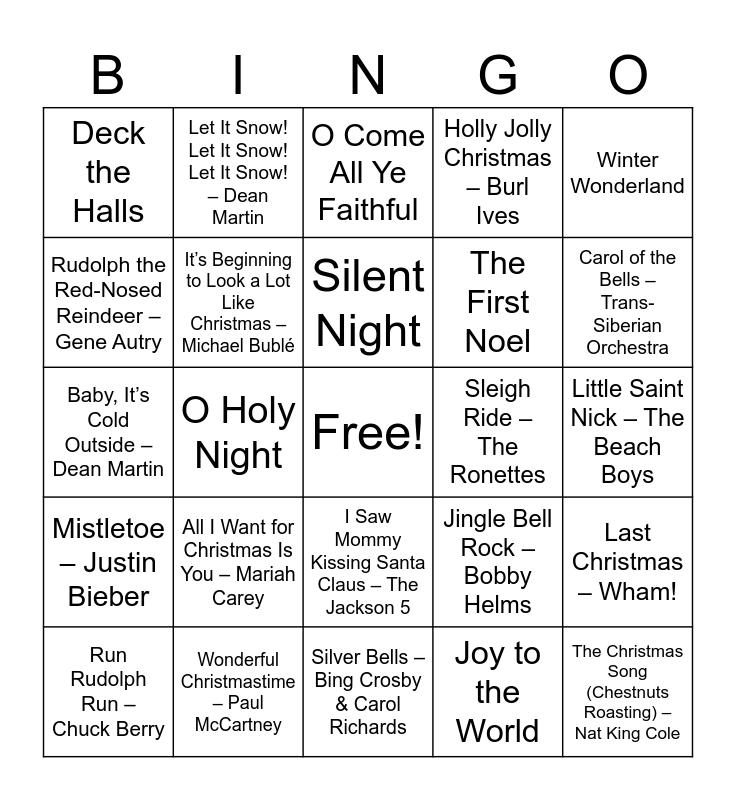 This bingo card has a free space and 50 words: Have Yourself a Merry Little Christmas – Judy Garland / Frank Sinatra, The Christmas Song (Chestnuts Roasting) – Nat King Cole, Blue Christmas – Elvis Presley, Silver Bells – Bing Crosby & Carol Richards, All I Want for Christmas Is You – Mariah Carey, White Christmas – Bing Crosby, Let It Snow! Let It Snow! Let It Snow! – Dean Martin, Frosty the Snowman – Jimmy Durante, Rudolph the Red-Nosed Reindeer – Gene Autry, Santa Claus Is Comin’ to Town – Jackson 5 / Bruce Springsteen, It’s Beginning to Look a Lot Like Christmas – Michael Bublé, Holly Jolly Christmas – Burl Ives, Last Christmas – Wham!, Jingle Bell Rock – Bobby Helms, Rockin’ Around the Christmas Tree – Brenda Lee, Jingle Bells, Silent Night, Sleigh Ride – The Ronettes, Feliz Navidad – José Feliciano, Winter Wonderland, O Holy Night, Joy to the World, Deck the Halls, The First Noel, Hark! The Herald Angels Sing, We Wish You a Merry Christmas, Carol of the Bells – Trans-Siberian Orchestra, Little Drummer Boy – Bing Crosby & David Bowie, O Come All Ye Faithful, I Saw Mommy Kissing Santa Claus – The Jackson 5, Do You Hear What I Hear? – Whitney Houston / Bing Crosby, Mary, Did You Know? – Pentatonix, Christmas (Baby Please Come Home) – Darlene Love, Happy Xmas (War Is Over) – John Lennon, Wonderful Christmastime – Paul McCartney, Mele Kalikimaka – Bing Crosby, I’ll Be Home for Christmas – Bing Crosby, Here Comes Santa Claus – Gene Autry, Up on the Housetop, Little Saint Nick – The Beach Boys, Grandma Got Run Over by a Reindeer – Elmo & Patsy, Silver and Gold – Burl Ives, Christmas Time Is Here – Vince Guaraldi, It's the Most Wonderful Time of the Year – Andy Williams, Run Rudolph Run – Chuck Berry, Baby, It’s Cold Outside – Dean Martin, Christmas Wrapping – The Waitresses, Underneath the Tree – Kelly Clarkson, Mistletoe – Justin Bieber and Believe – Josh Groban.