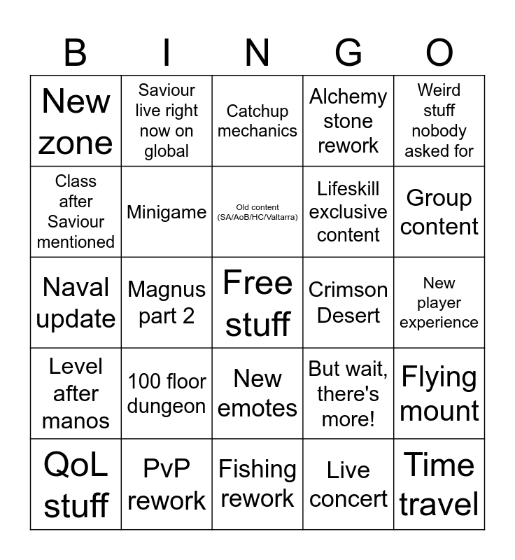 This bingo card has a free space and 24 words: 100 floor dungeon, PvP rework, Old content (SA/AoB/HC/Valtarra), QoL stuff, Weird stuff nobody asked for, New zone, Class after Saviour mentioned, Saviour live right now on global, Crimson Desert, New emotes, Lifeskill exclusive content, Naval update, But wait, there's more!, Flying mount, Minigame, Live concert, New player experience, Catchup mechanics, Group content, Magnus part 2, Time travel, Level after manos, Alchemy stone rework and Fishing rework.